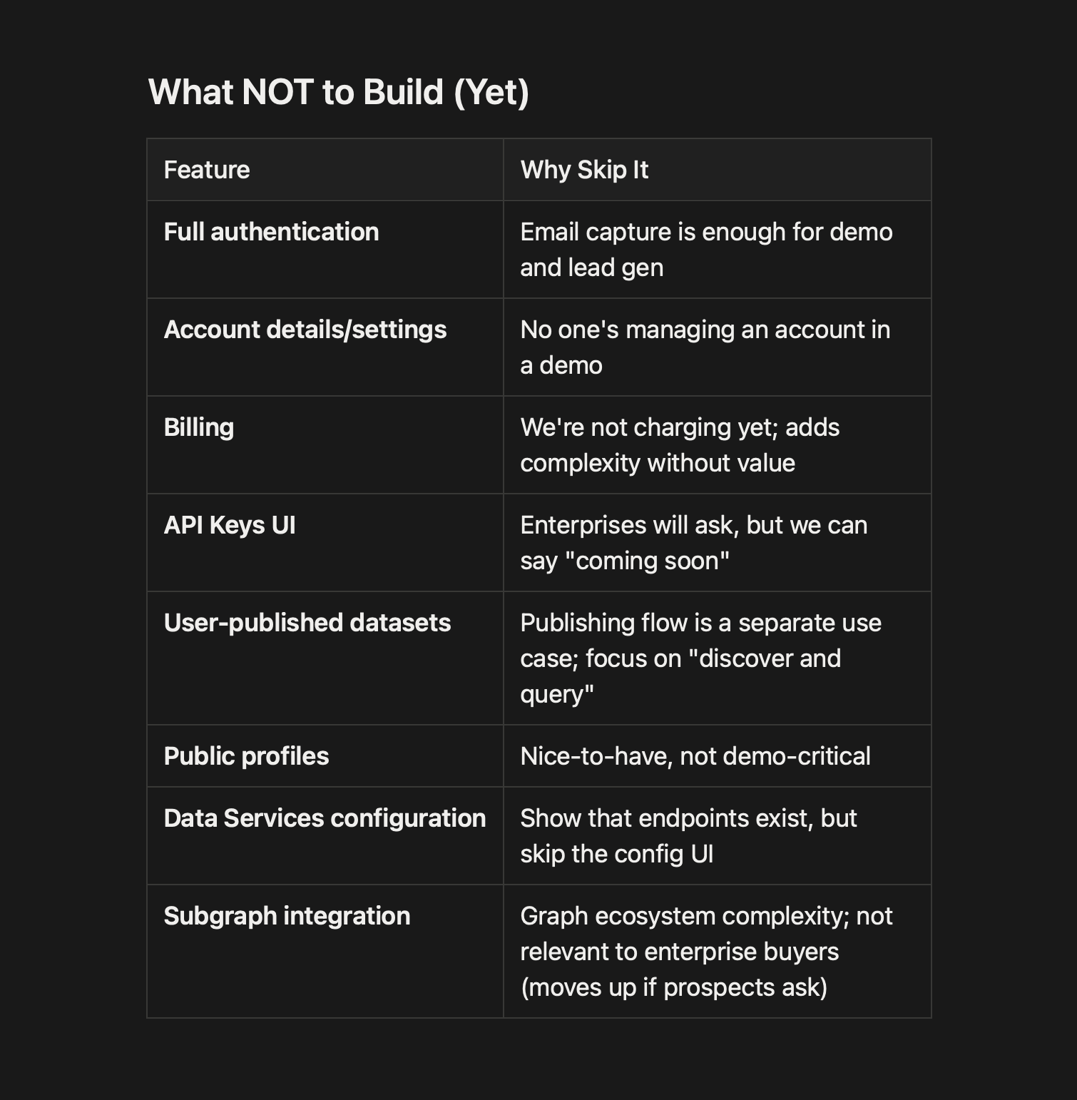 Explicit "what we're NOT doing": billing, full auth, subgraph integration, API key management UI, mobile optimization