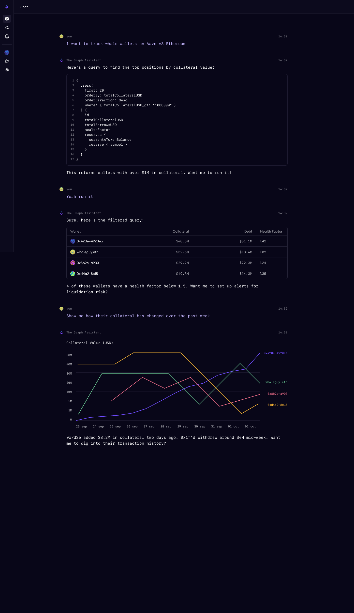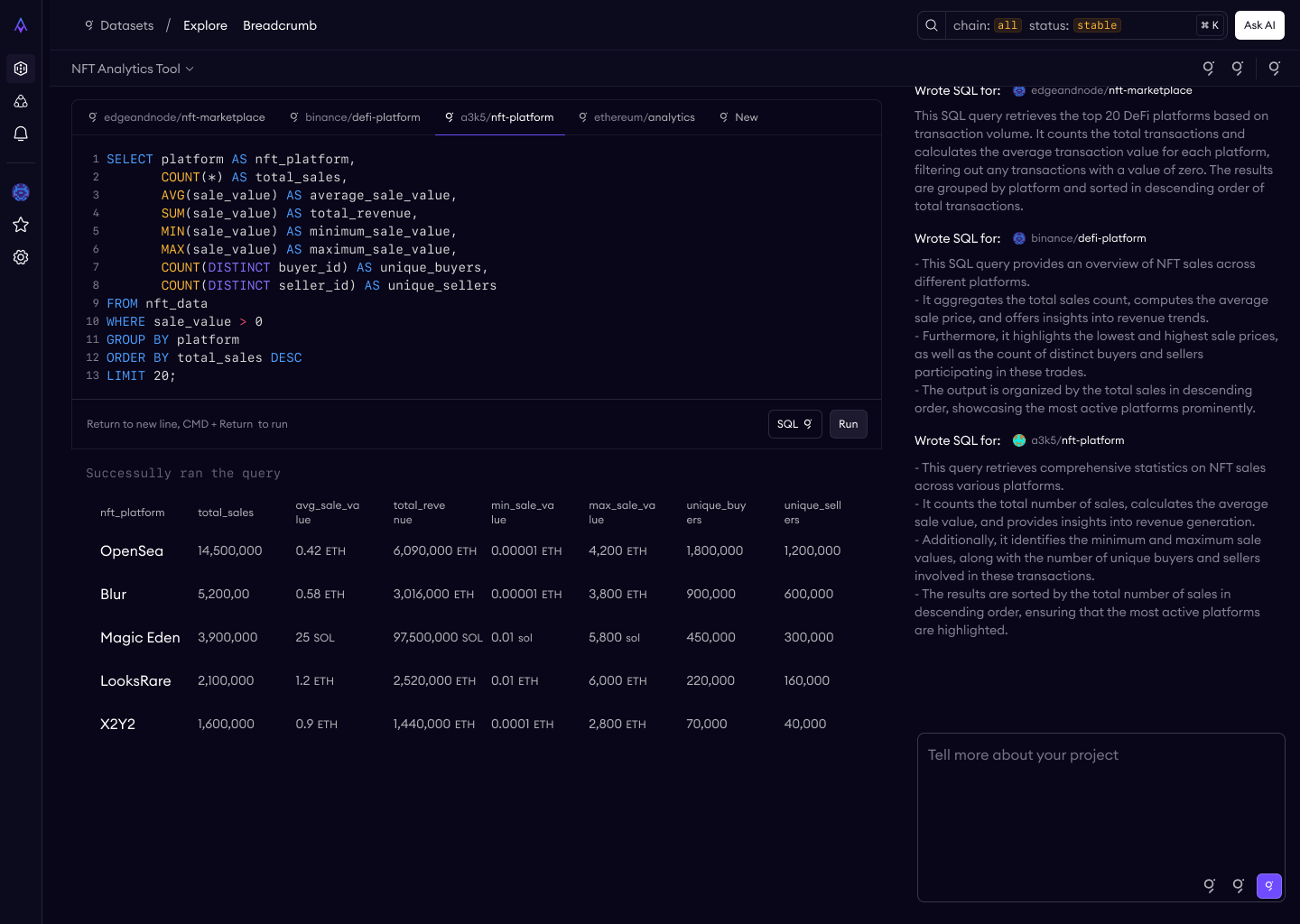 The most complex feature in the demo was "Ask AI" — a natural language interface where users ask questions about blockchain data and the system generates SQL, executes it, and shows results. This is the feature that would differentiate us in live demos and make the platform feel genuinely next-generation.