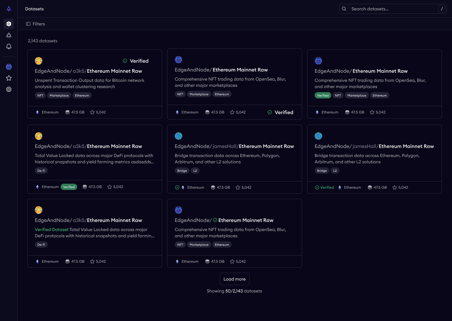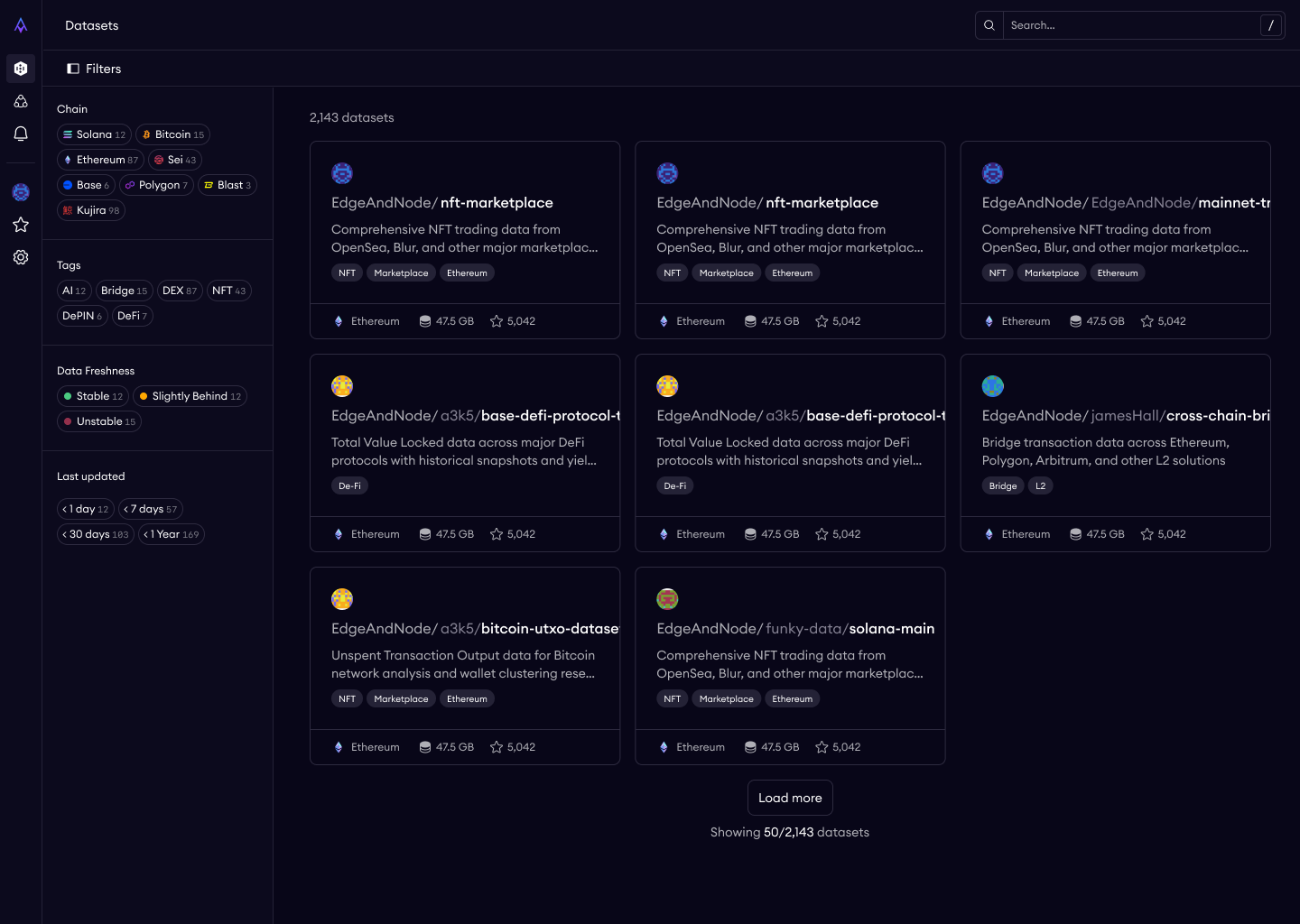 Search by protocol, chain, tags, keyword. Blockchain data users have strong domain-specific mental models — they think in terms of chains (Ethereum, Solana) and data categories (DEX trades, token transfers, NFT activity). The information architecture mirrors how practitioners actually think about blockchain data, not how our database happens to organize it.
