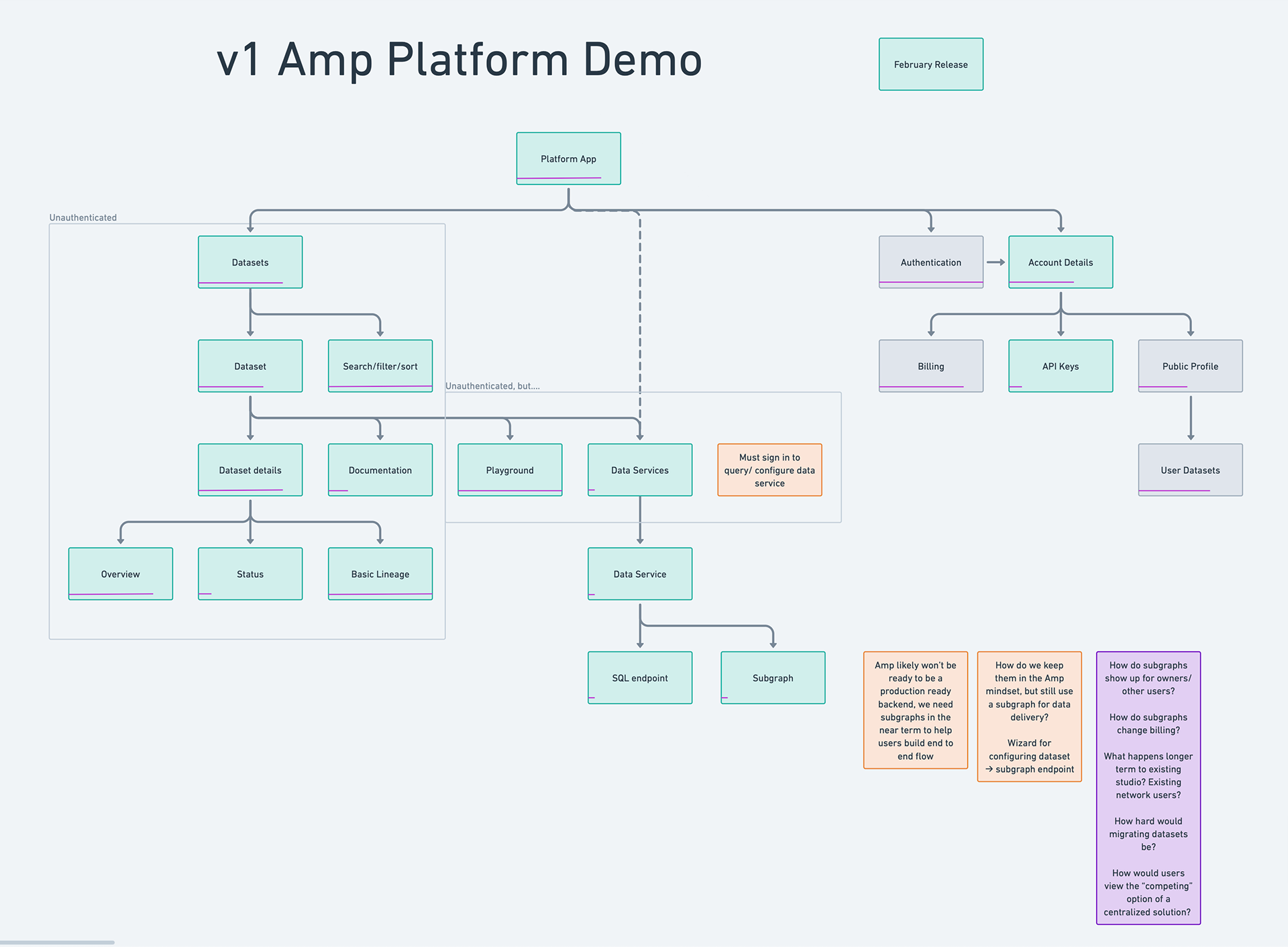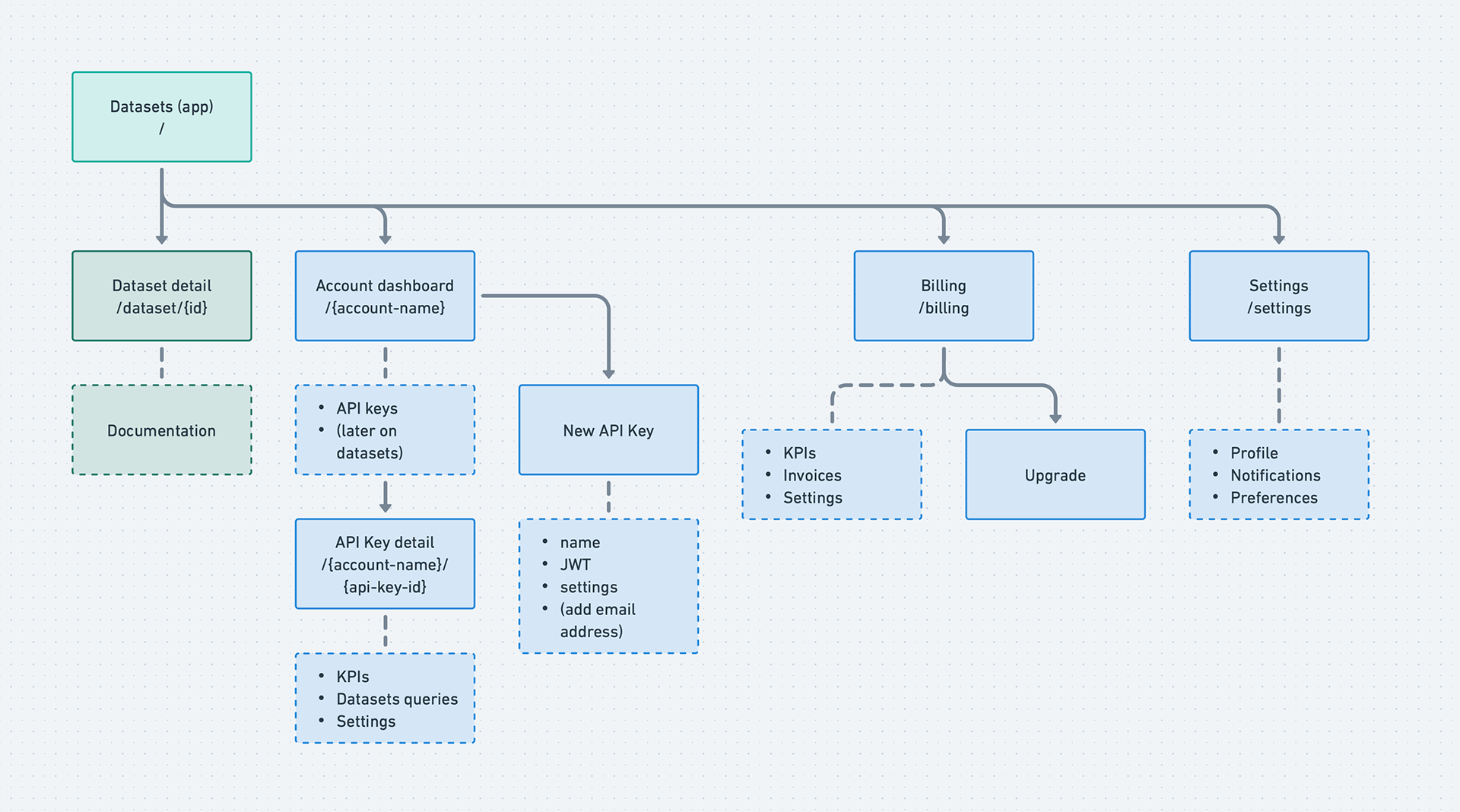 What this diagram reveals is the fundamental split that drove the entire platform architecture: the left side (Datasets → Dataset detail → Documentation) is public and unauthenticated. The right side (Account dashboard → API keys → Billing → Settings) is private and gated. The auth boundary runs right down the middle. Every design decision about where to place the email gate, what to show signed-out users, and how to structure the demo flow traces back to this split.