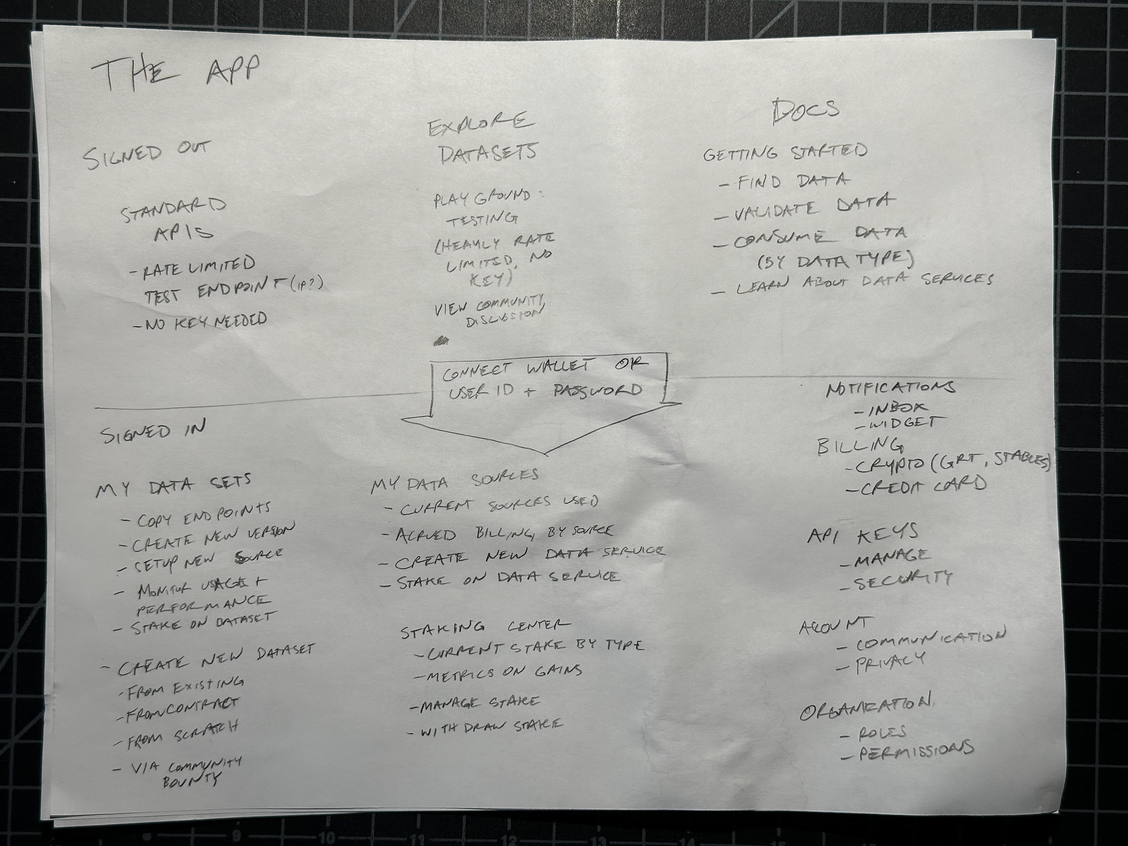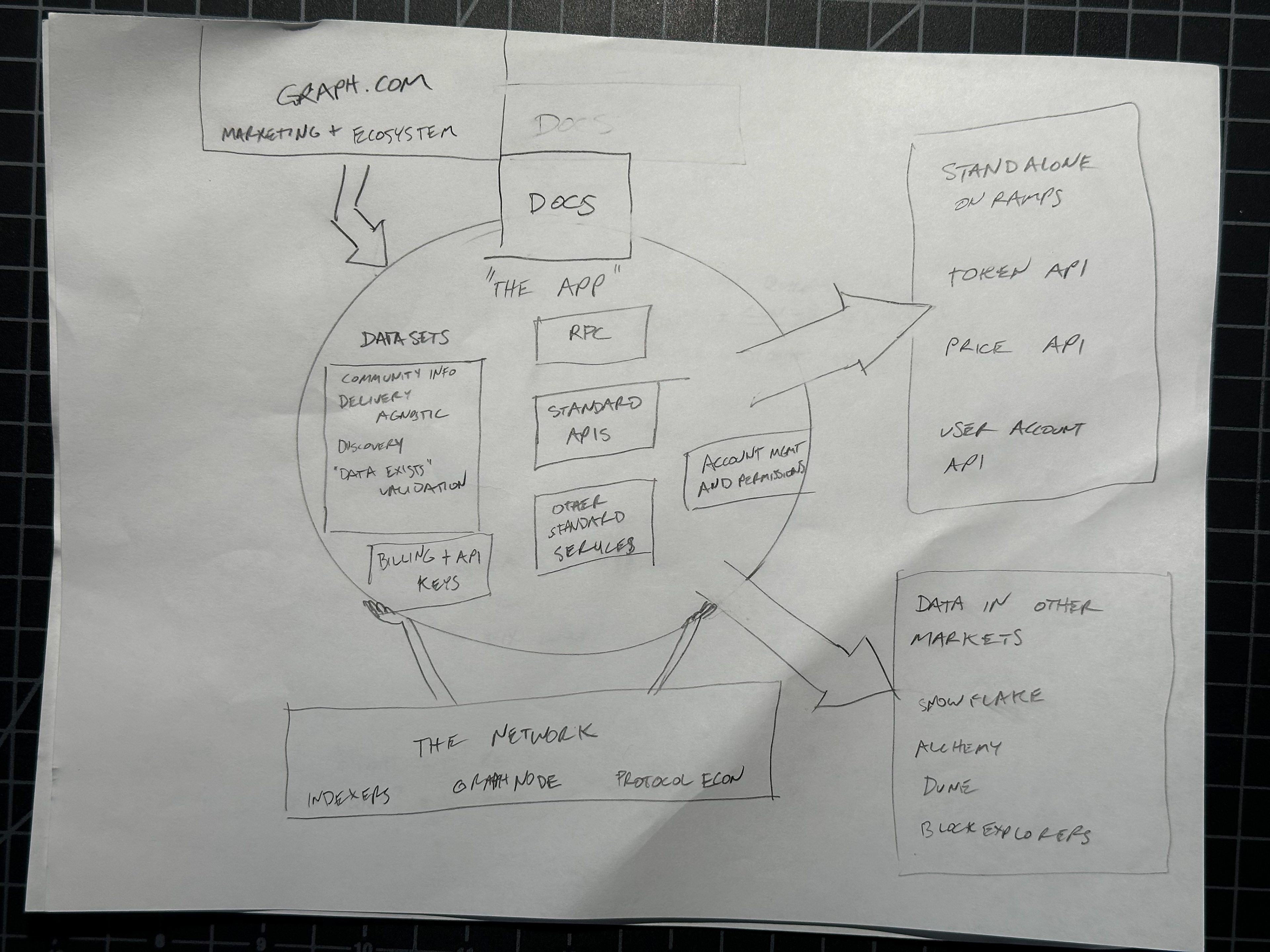 The original vision for the platform was a public SaaS product for application developers — a self-service tool where developers could discover, query, and build on blockchain datasets. I spent significant time researching how to design for network effects: how community contributions, ratings, and shared datasets could create a flywheel that made the platform more valuable as more developers used it. The early sketches reflect this thinking — features like "rate and review dataset," "request additional entity," "submit PR to fix data/transformation," and community bounties for dataset creation.