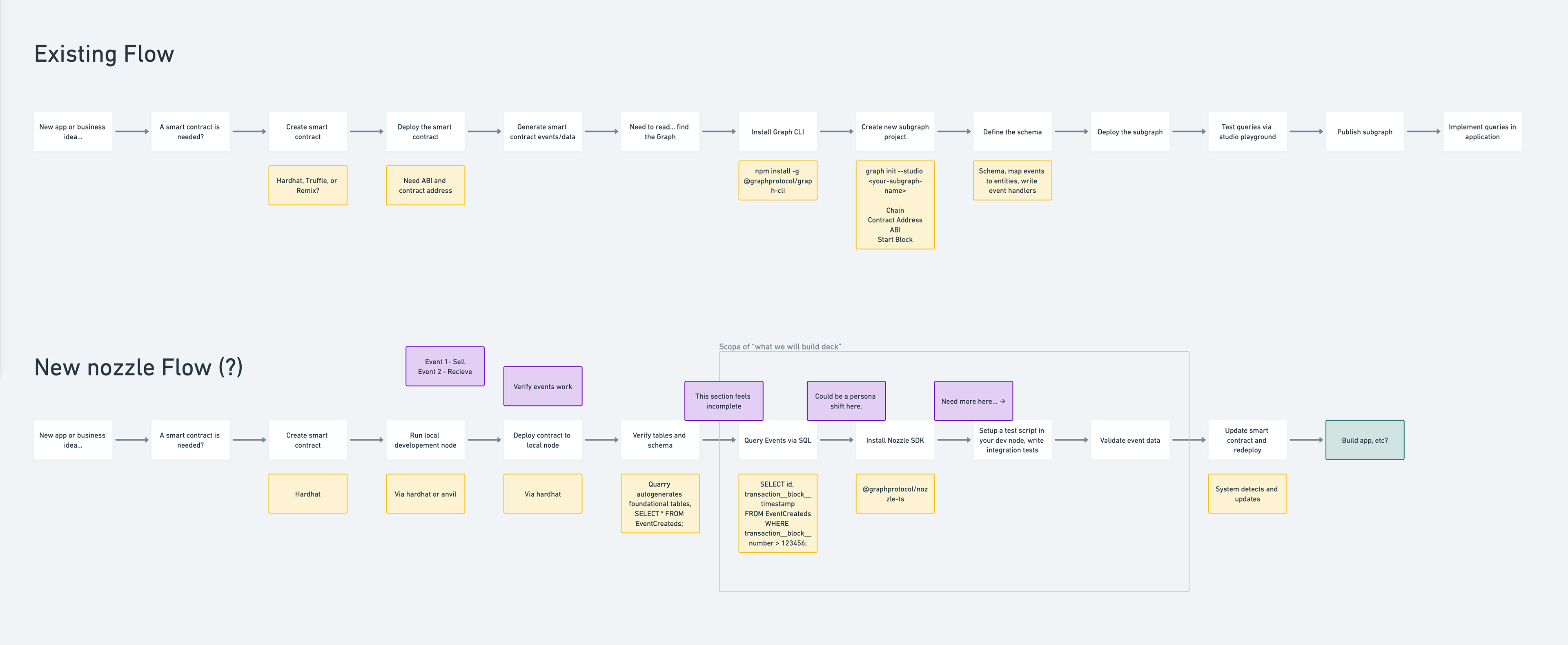 Before designing the platform UI, I needed to understand the developer experience we were trying to improve. I mapped the existing subgraph workflow end-to-end — from "new app idea" through smart contract deployment, Graph CLI installation, schema definition, subgraph deployment, and finally querying via the studio playground. Then I mapped the proposed Nozzle flow side by side: the same developer, starting from the same place, but reaching queryable data in a fraction of the steps.