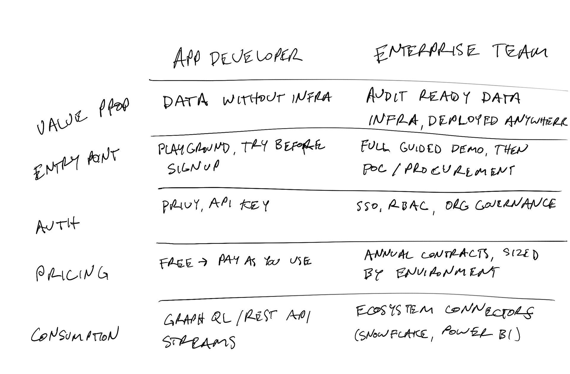 This wasn't just a messaging exercise — it shaped real product decisions. It told us what to build first (the query experience, which serves both audiences) and what to defer (full RBAC, which only enterprise needs on day one).